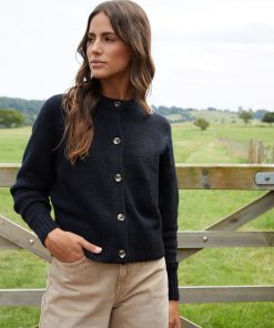 Crafted in a jersey stitch, this long sleeve cardigan has a ribbed crew neck collar, cuffs and hem with dropped shoulders, and fastens with five buttons.